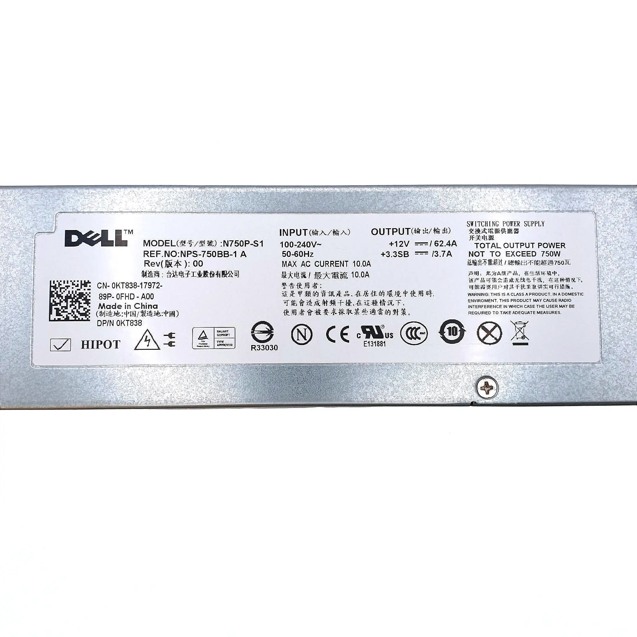 Zasilacz Dell 750W Hot-Swap 80 Plus Silver 0KT838 / N750P-S1